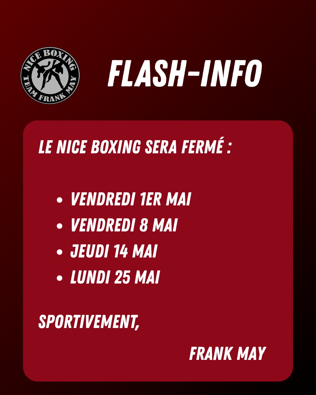 Le NICE BOXING Team Frank MAY, 1er club de France, avec près de 600 adhérents est heureux de vous accueillir sur son site qui va vous présenter en détails toutes les facettes, services et activités proposées par ce club au passé riche et à l’actualité débordante.